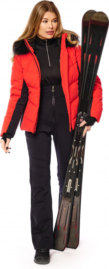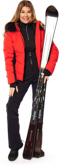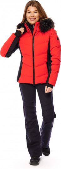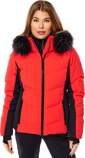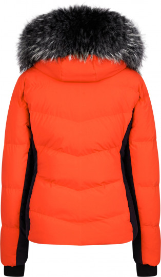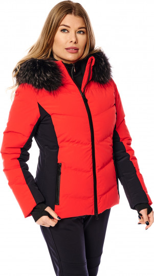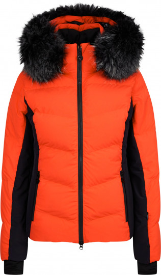 Воротник-стойка с капюшоном, удобные манжеты и наполнитель из натурального гусиного пуха обещают уютное тепло даже в морозные дни. Два вшитых по диагонали кармана на молнии спереди и карман на молнии в шве на рукаве обеспечивают место для хранения необходимых на склоне вещей. Боковые вставки и вставки на рукавах из чёрной ткани подчеркивают спортивный дизайн. Эта куртка привлечет всеобщее внимание, будь вы на склоне или прогуливаетесь по городу. Образ можно по желанию дополнить полоской натурального меха на капюшоне.