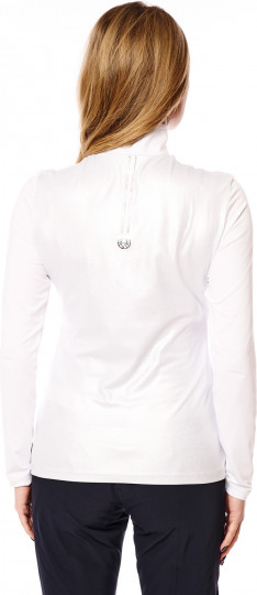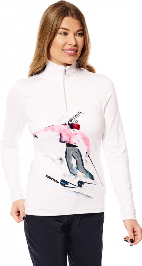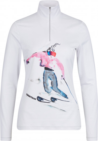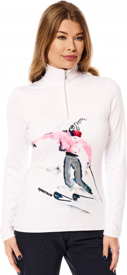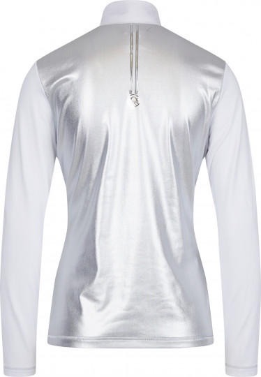 Это горнолыжное белье — настоящее произведение искусства благодаря принту ручной работы спереди и сочетанию интересных материалов и декоративных деталей, таких как стразы, металлические точки и переводная фольга. Задняя часть выполнена из серебристого металлического трикотажа и украшена 3D-принтом. Передняя часть и рукава выполнены в белом цвете. Плоские швы, отделанные серебристой нитью, использованы в качестве элегантных акцентов. Воротник-стойка с молнией по центру спереди завершает образ.