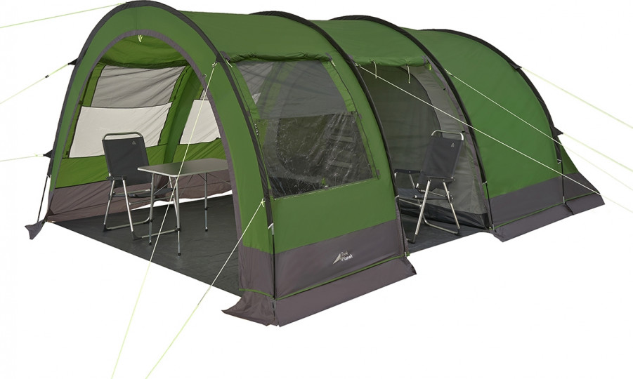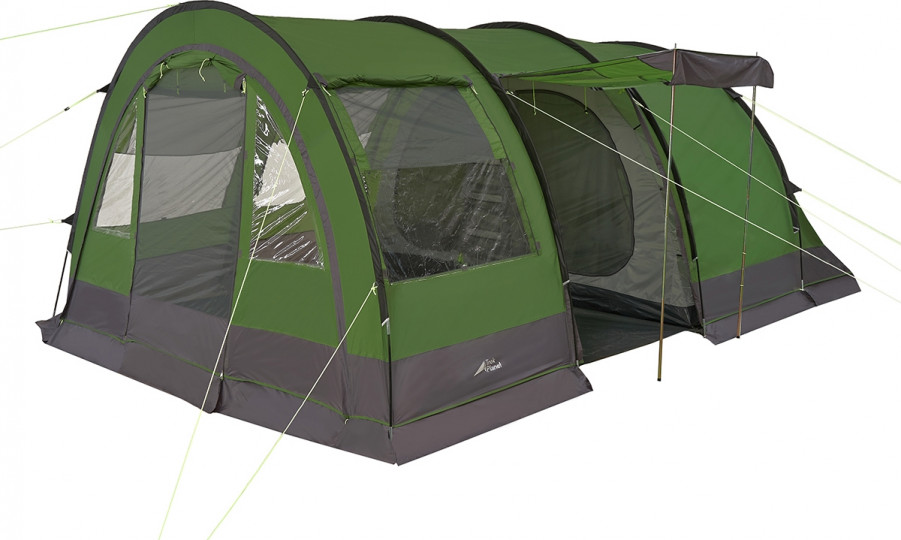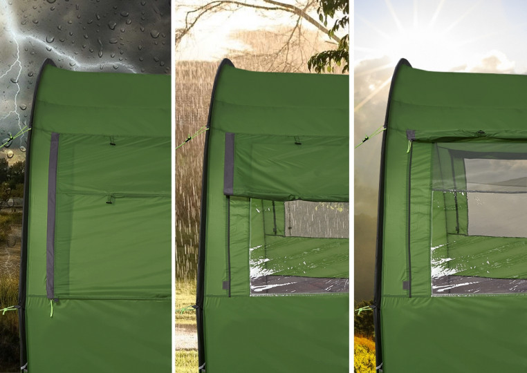 Внешний материал тента выполнен из прочного полиэстера с водостойкостью 4000 мм, что позволяет продолжать приятный отдых даже в сильный дождь и ветер. Между дверьми в спальное отделение предусмотрен ряд карманов для разных мелочей. Чтобы и вечером можно было провести время в уютной компании, можно подвесить фонарь за крючок в тамбуре.