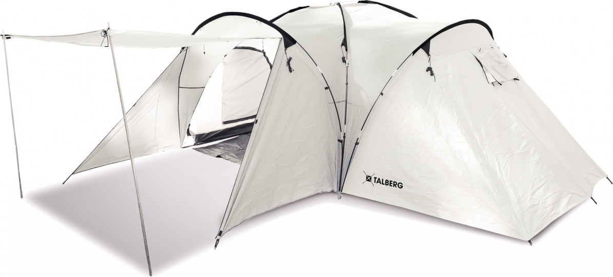 Простая и понятная конструкция, Вы можете установить палатку буквально в течение 10–15 минут. Рассчитанная на шесть человек палатка, общей площадью более 13 м/2, имеет идеальное соотношение объем-вес и удобную сумку для переноски. Внешний тент надежно защищает от сильного ветра и атмосферных осадков. Тамбур площадью 4,5 м/2 имеет съемный пол из армированного полиэтилена. Размер тамбура позволяет разместить все необходимое снаряжение, а так же набор кемпинговой мебели, для комфортного времяпрепровождения. По необходимости размер тамбура можно увеличить до 7 м/2, просто сняв центральное спальное место и оставив два места на четыре человека. Вход в тамбур продублирован москитной сеткой, имеет боковые стенки и надежно защищает от насекомых. Дверь центрального входа можно использовать, как солнцезащитный козырек, установив его на стальных стойках (идут в комплекте). Юбку из армированного полиэтилена, можно быстро подвернуть, благодаря специальным затяжкам. Двухслойная конструкция палатки отлично испаряет конденсат и способствует комфортному проживанию в походных условиях. Модель рекомендуется для использования в сезон весна-лето-осень в солнечных регионах.