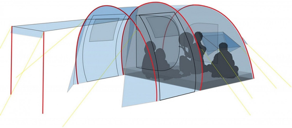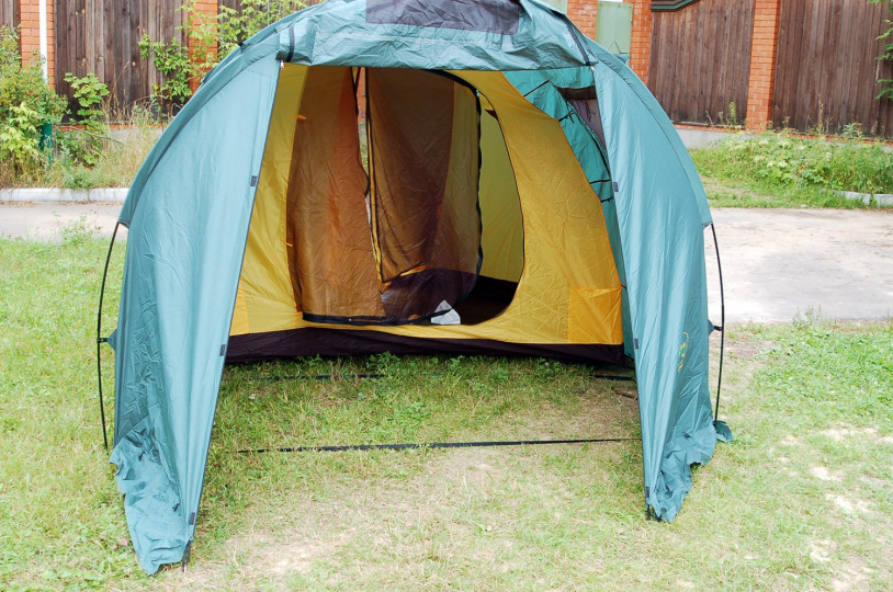 Четыре входа и большие вентиляционные окна обеспечат комфорт даже в летний зной. Палатка имеет большой тамбур для хранения туристической экипировки. Для увеличения внутреннего пространства можно использовать тент без спального отделения.