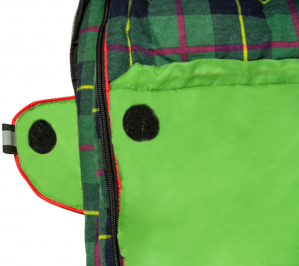 Даже в полной темноте ребенок на ощупь определит плоскую стропу, которая затягивает верх капюшона, и круглый шнур для затяжки нижней части капюшона. Обе затяжки фиксируются пластиковым крючком с внешней части спальника, чтобы во время сна они не ложились ему на лицо.