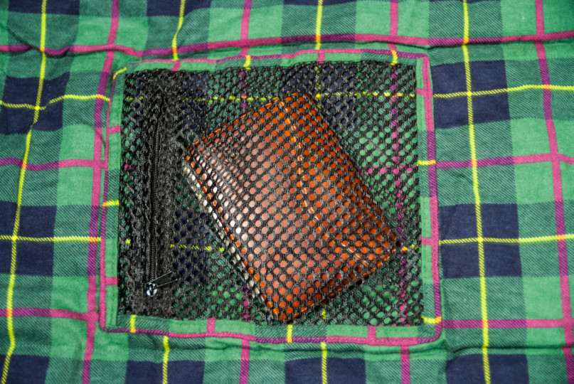 Внутри спального мешка есть большой сетчатый кармашек для носового платка и всяких мелочей. Через сетку сразу видно, что лежит внутри.