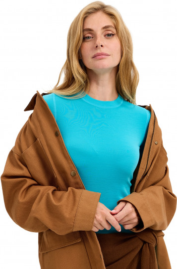 Рубашка с удлиненной поясничной частью, круглой горловиной и манжетами на рукавах красиво садится по фигуре. Может использоваться в качестве самостоятельного предмета одежды, который следует дополнить пиджаком или пуловером.