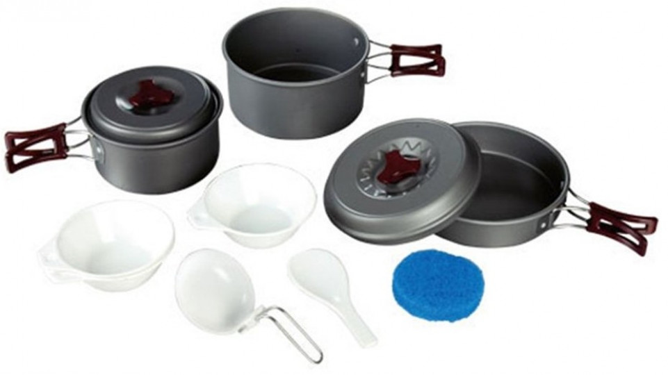 Комплектация: котелок 1.75 л с крышкой и складными ручками, котелок 1 л с крышкой и складными ручками, сковорода 177 мм со складными ручками, ложка суповая, поварешка, тарелки глубокие пластмассовые 3 штуки, губка для мытья посуды. Упакован в тканевый мешок