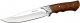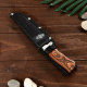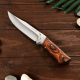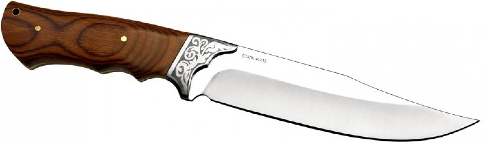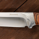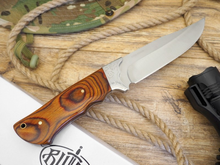 Деревянная рукоять красива, эффектно выглядит, а кроме того удобна благодаря хорошо выраженным подпальцевым выемкам и больстеру, который служит небольшим упором для указательного пальца. Фигурный больстер также служит декоративным элементом благодаря символическому узору на растительную тематику.