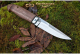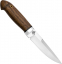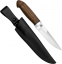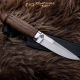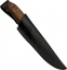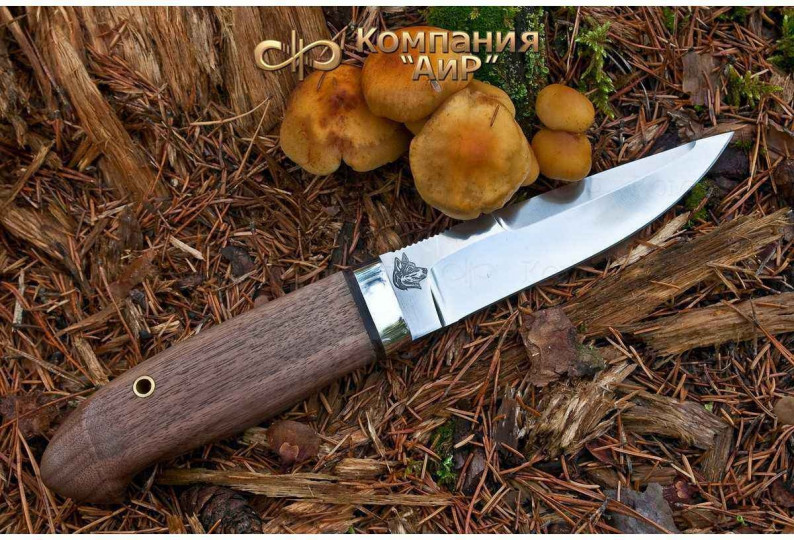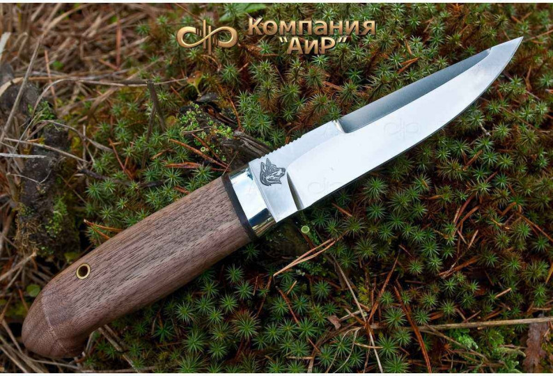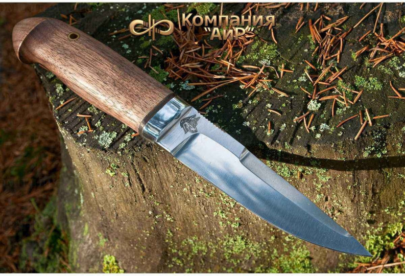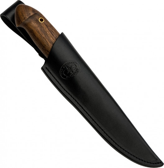 Универсальный легкий и прочный нож с мощным и изящным клинком, имеющим приспущенный обушок. При толщине пяты в 5 мм, за счет широкого фальшлезвия, не доходящего до острия 15 мм и широких плавных обратнолинзовидных спусков, клинок получился легким, с отличными режущими качествами. На обухе клинка у рукояти есть насечка для резов с упором большого пальца в обушок. Нож прекрасно сбалансирован. Эргономичная форма рукояти в скандинавском стиле уверенно и прочно ложится в любую ладонь, даже в рукавице. Небольшая подпальцевая выемка не дает соскользнуть пальцам при резах от себя. Монтаж рукояти всадной, неразборный. На рукояти ближе к навершию есть отверстие под темляк. Отличный выбор для большинства видов работы в лесу.